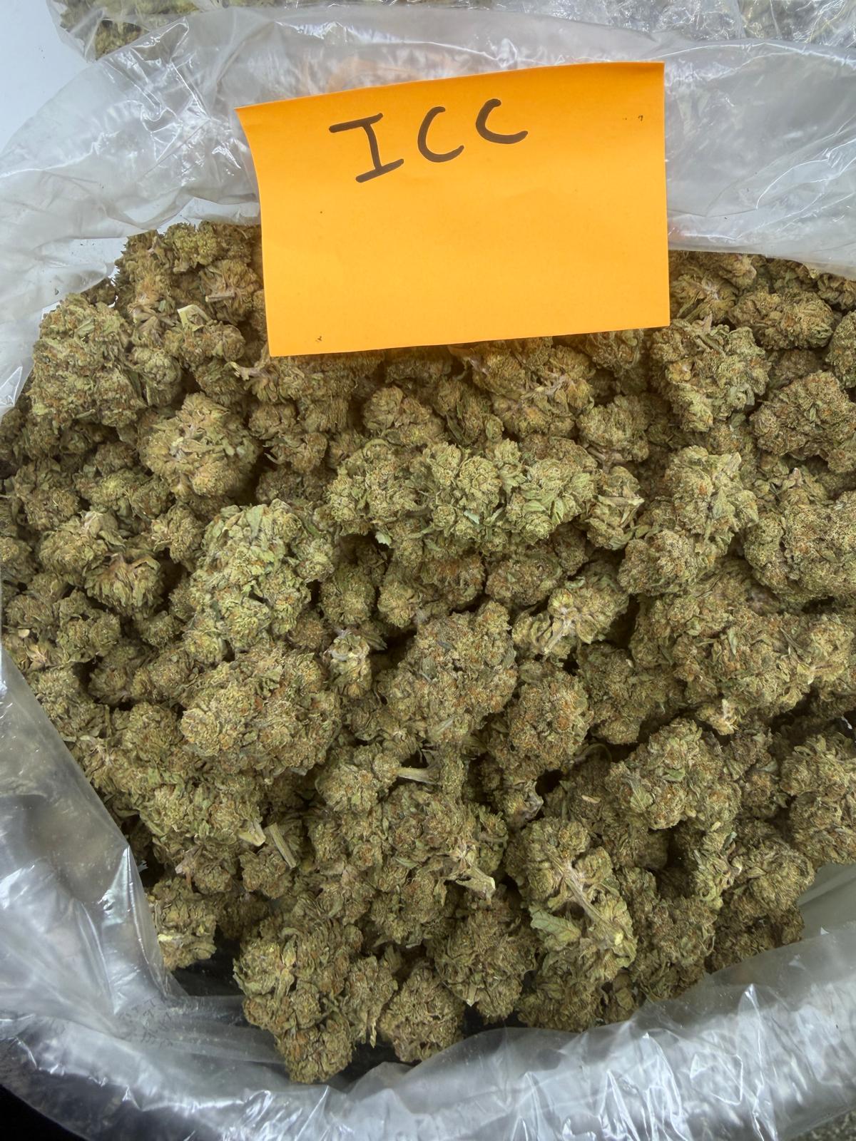 ICC has small dense grape-shaped forest green nugs with thick orange hairs and frosty white crystal trichomes.